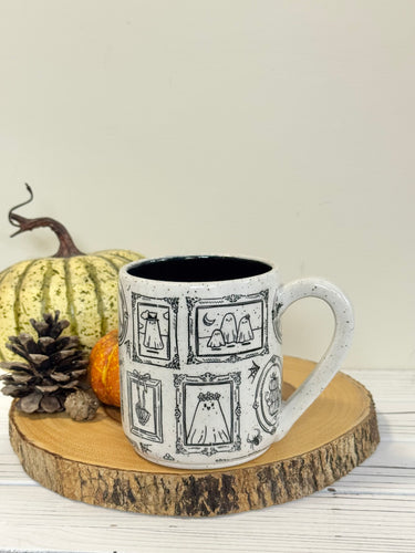 sold out#002 - 16 oz. White speckled mug with Halloween ghost patterns. Black inside. * See notes