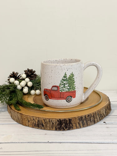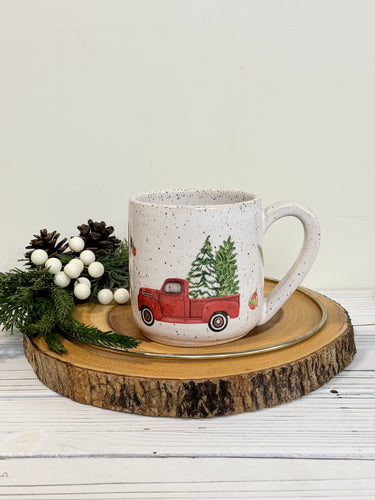sold out#006 - 14 oz. Red truck, Christmas tree pattern on White speckled mug