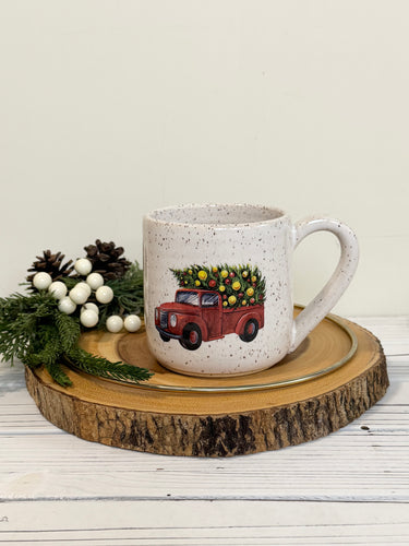 sold out#005 - 14 oz. Red truck, Christmas tree pattern on White speckled mug