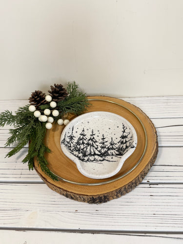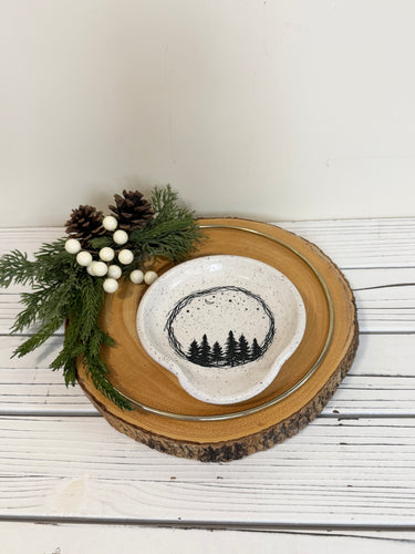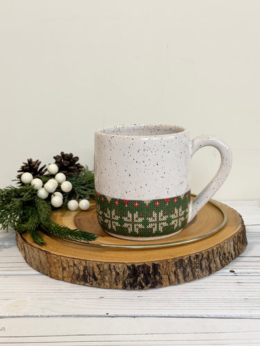 sold out#009 - 16 oz. White speckled mug with Christmas sweater pattern on bottom, on unglazed clay