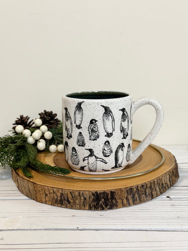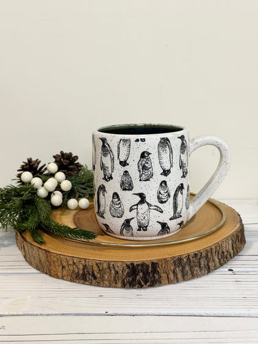 sold out#018 - 16 oz. Penguin pattern on white speckled mug with dark blue glaze inside