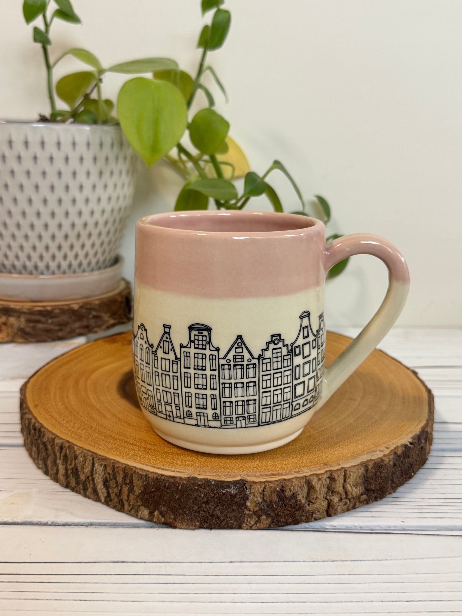 #021 - 16 oz. Amsterdam house patterned mug with pink rim