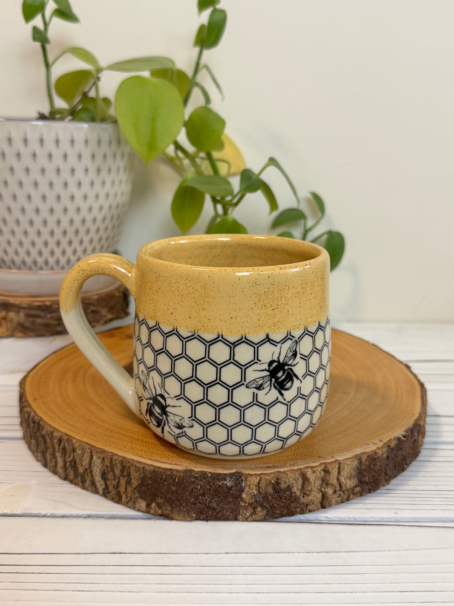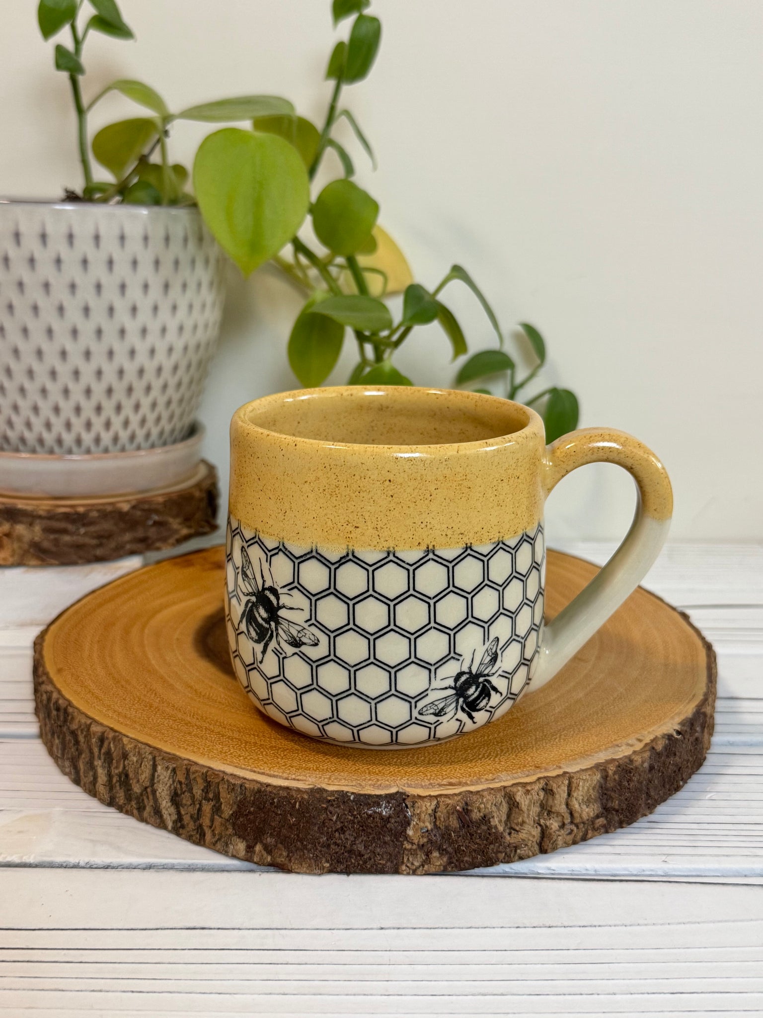 #023 - 16 oz. Honeycomb and bee patterned mug with honey coloured rim