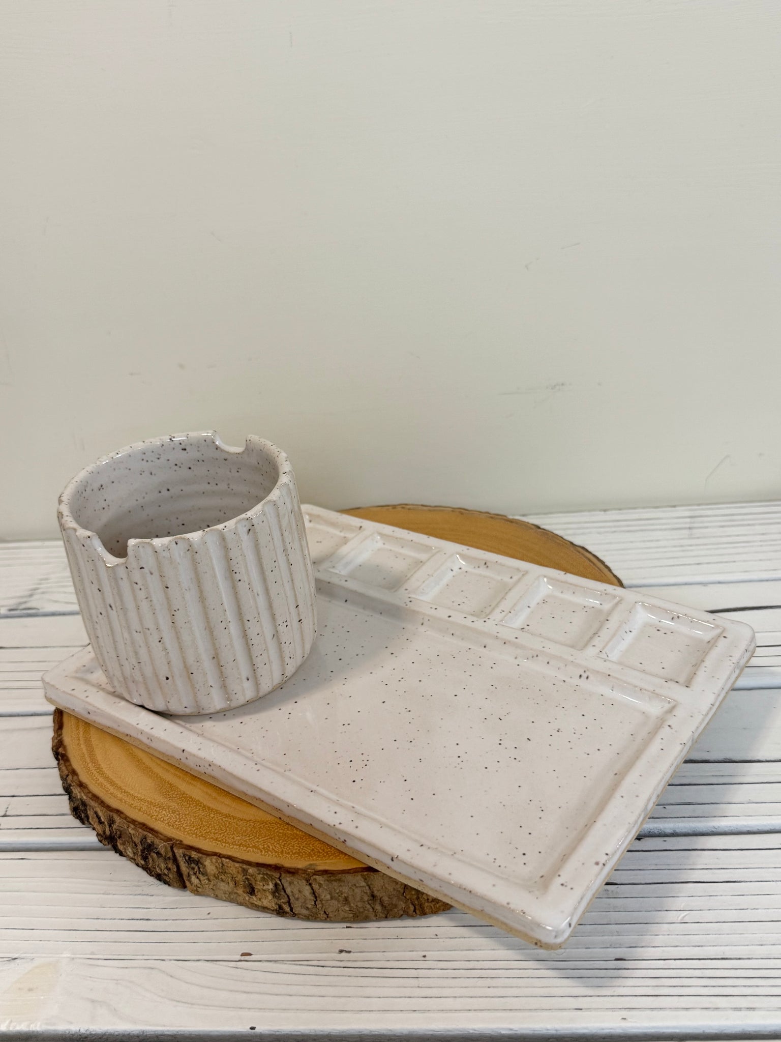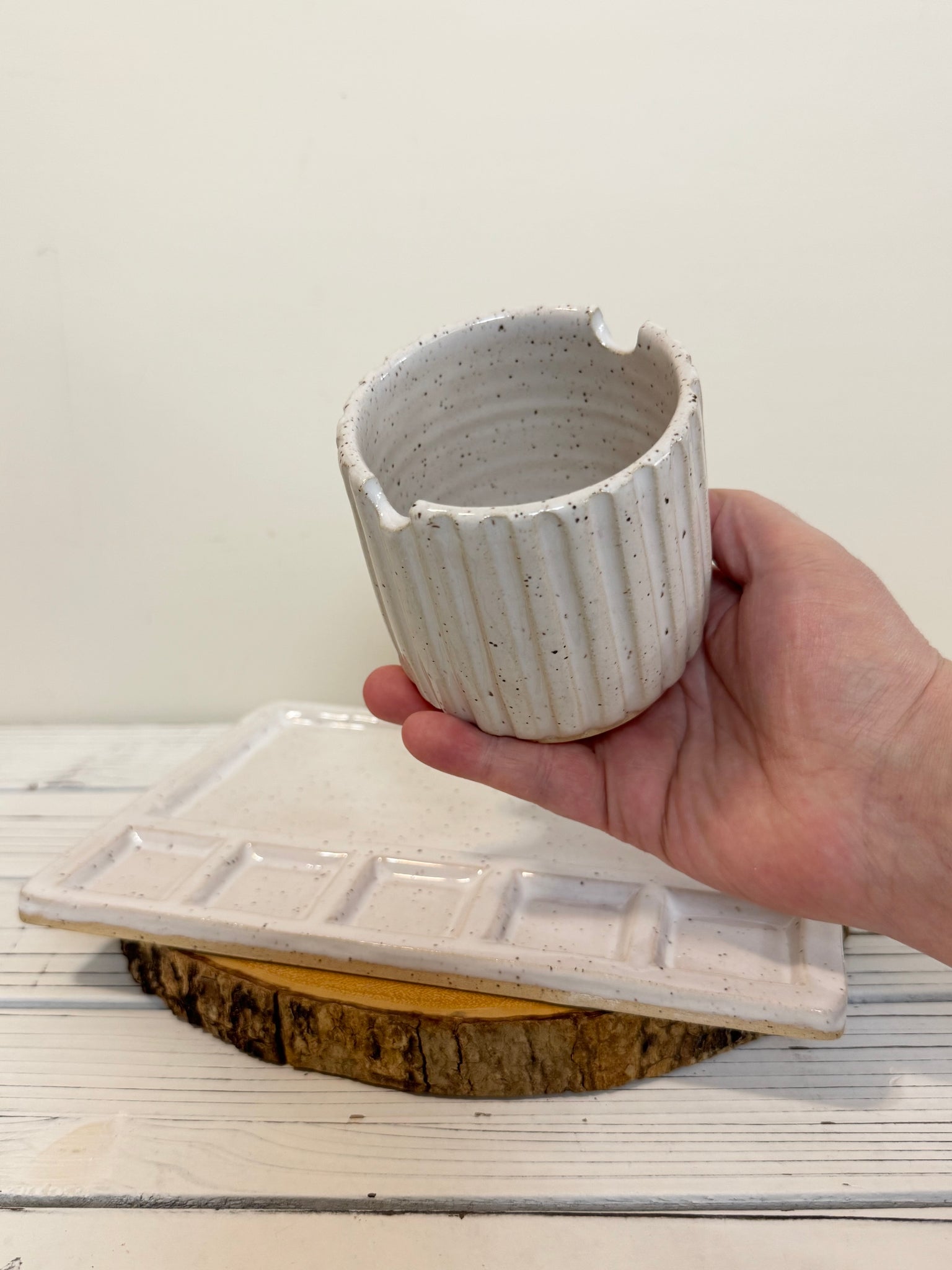 Handmade pottery paint brush holding water cup and paint palette set